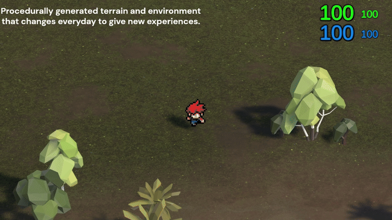 Procedural Generation was a key feature of the game. The game was built in Unity with C# and HLSL. The terrain and environment were generated with the Day as the seed. This ensured that the world would be new every Day.