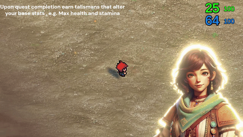 Upon quest completion, the player is rewarded with a talisman. The talismans are generated by ChatGPT and have their own attributes. The player can equip these talismans to gain different altered stats. The talisman's attributes and values are generated according to the difficulty of the completed quest. Asking Questra for a problematic quest would give better talismans on completion with the added challenge of enemies with better stats. Talismans can stack their attributes, so the order of talisman application can vastly vary the effects provided.
